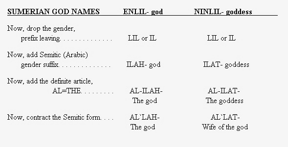 Now, here is the heart of the matter from the linguistic, historic, and epigraphic evidence. Seeing this will help you to follow the migration of the god IL (or LIL) on his way from Sumer to Arabia and Mecca where he became Allah.  Start at the top with the Sumerian name for the god and goddess.