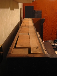 hole out the back of the piano. You are drilling through very old hard wood, so